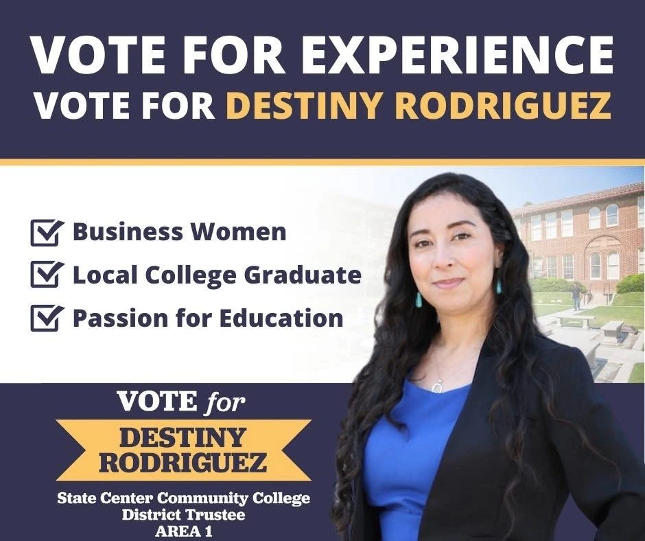 Destiny Rodriguez has been part of the Central Valley for many years, working tirelessly to make it a better place. Join our campaign today to re-elect Destiny to SCCCD Area 1!